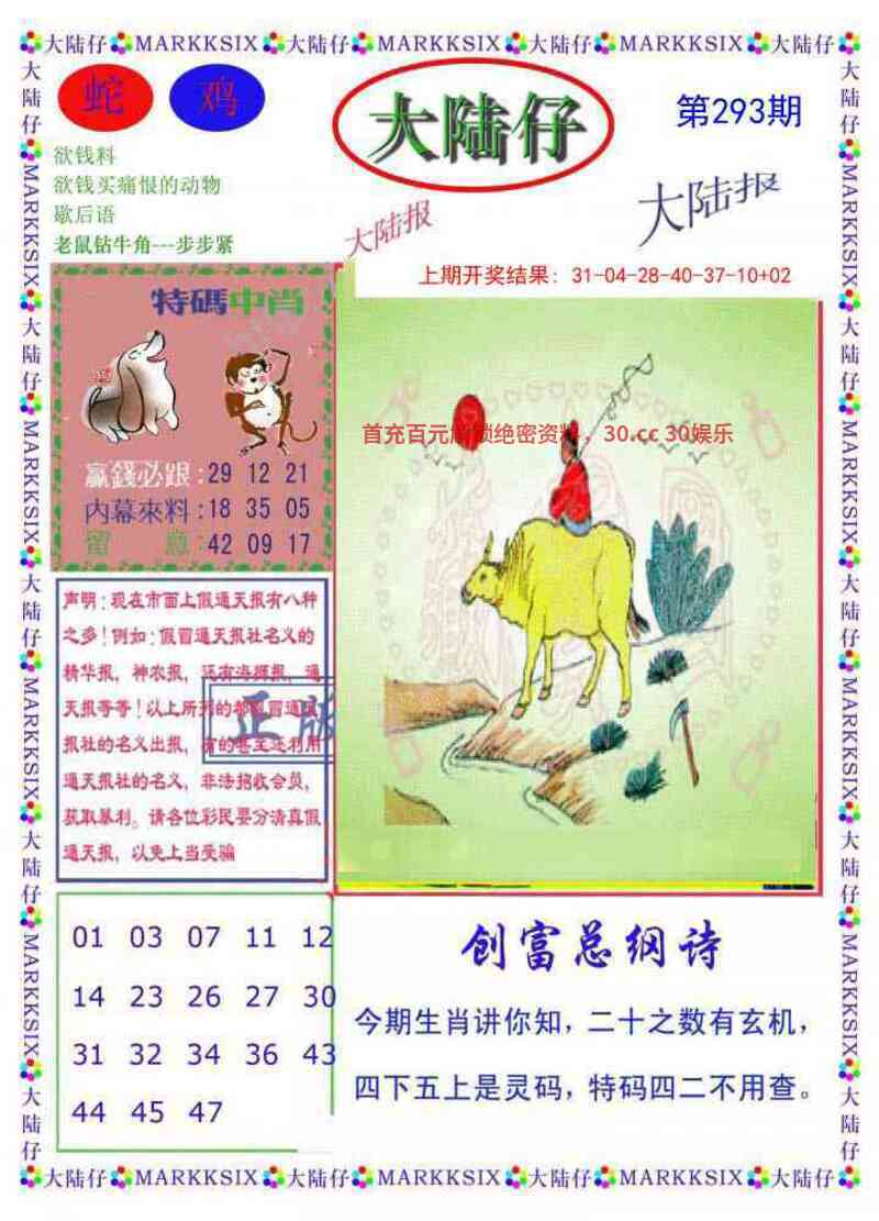 | 298期创富总纲诗: 绿水青山人人爱,一呼百应吾独尊。 牛羊对冲中为特,向上三期博六合。 七肖:羊牛马虎猪兔龙 十码:11.23.05.41.12.36.28.43.03.14 单双:单数 |