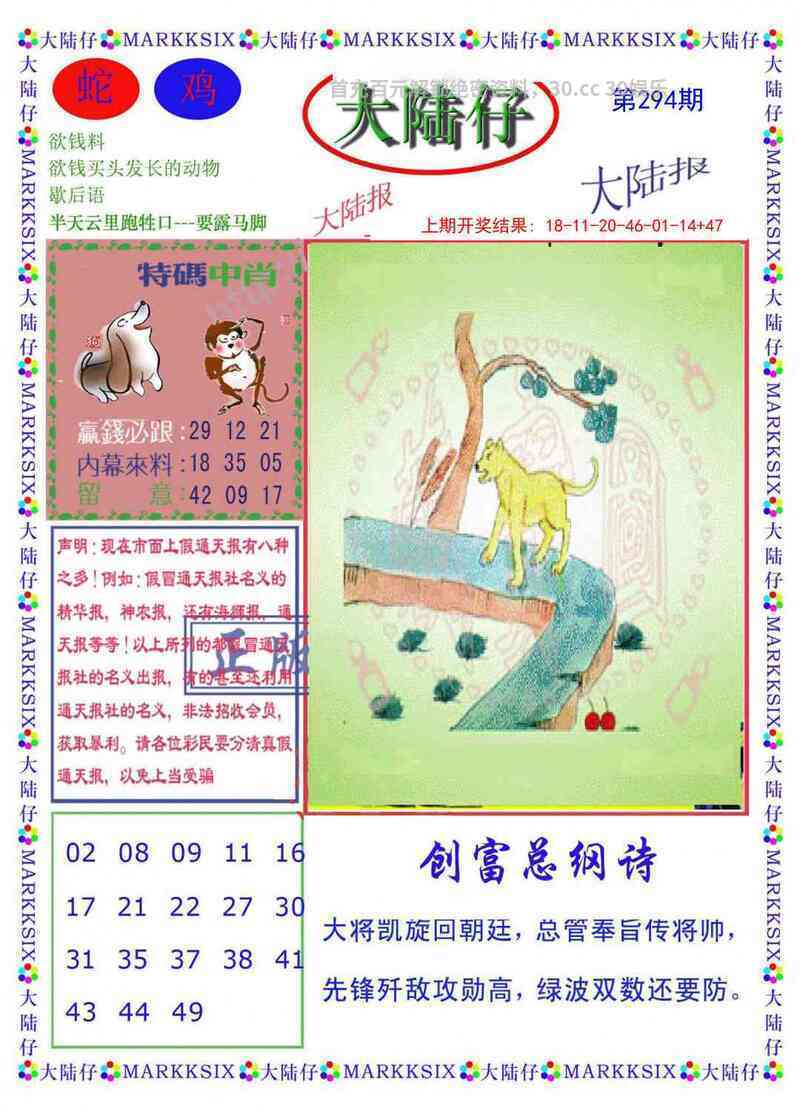 | 294期创富总纲诗: 大将凯旋回朝廷,总管奉旨传将帅。 先锋歼敌攻勋高,绿波双数还要防。 单双:双数 |