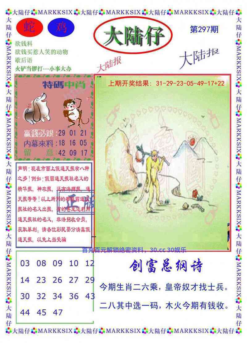 | 297期创富总纲诗: 今期生肖二六乘,皇帝奴才找士兵。 二八其中选一码,木火今期有钱收。 七肖:龙兔猴马狗鸡羊 单双:双数 |